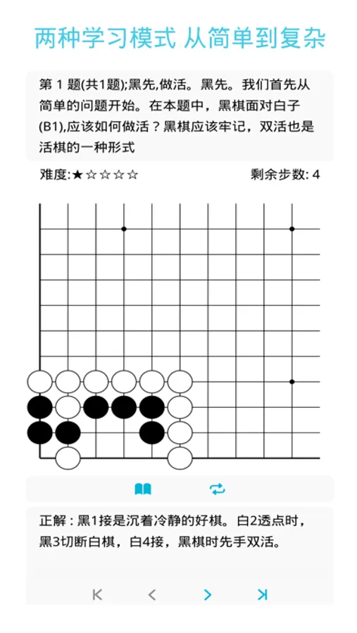 这一款围棋软件是将日常的学习以及训练对弈结果为基础,通过统计和人工智能辅助给用户学习围棋的薄弱知识点,并给予加强练习,这款软件让用户专注于练习死活题,通过做题的积累以及难点分析,可以系统的学习围棋的知识要点,达成快速升级入段的学习目标!