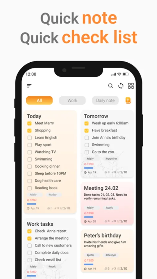 • Capture ideals, notes at a moments notice with text, check box, picture