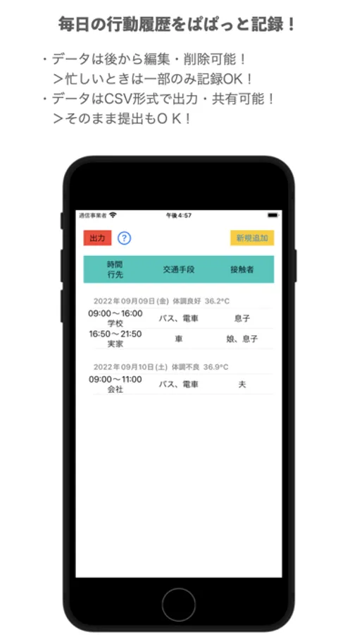 ※CSVデータをExcelで開くと、文字化けする場合がありますが、解決方法をアプリ内ヘルプボタンで見れます!