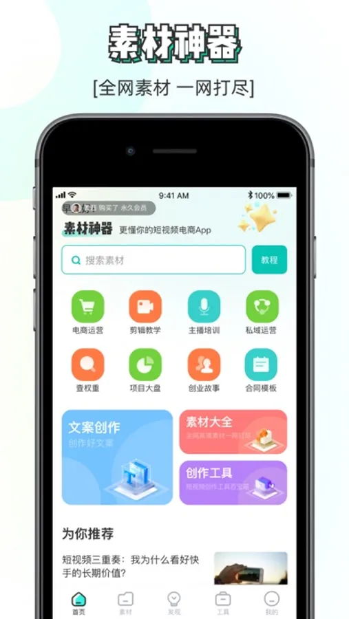素材神器是一款短视频,UP主必备的素材软件工具大全,视频制作辅助神器,收录了大量的高清无水印视频素材、炫酷视频特效、BGM背景音乐、视频配套文案、各类素材模板,还提供了短视频去水印保存、一键提取短视频视频文案、一键提取短视频配音文案、一键保存高清视频、图片、音频、文案、修改短视频Md5等工具,素材神器是抖音快手小红书制作短视频专用的辅助工具。还有更多实战,引流推广,剪辑教学,主播培训等教学教程,无论你是视频剪辑入门新手还是剪辑大师都能轻松上手,快来制作你的专属DIY视频吧!短视频视频剪辑就上素材神器。短视频创作者的一站式服务平台