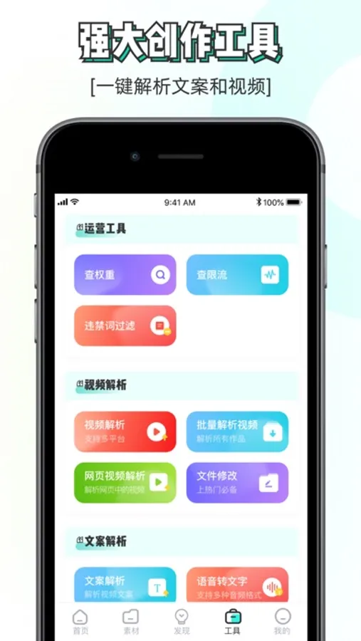 视频提取文案、违禁词检测、提词器、数据监控、账号诊断、账号估价、视频镜像、MD5修改、图片转文字、语音转文字、长图拼接及抖音权重查询工具等。