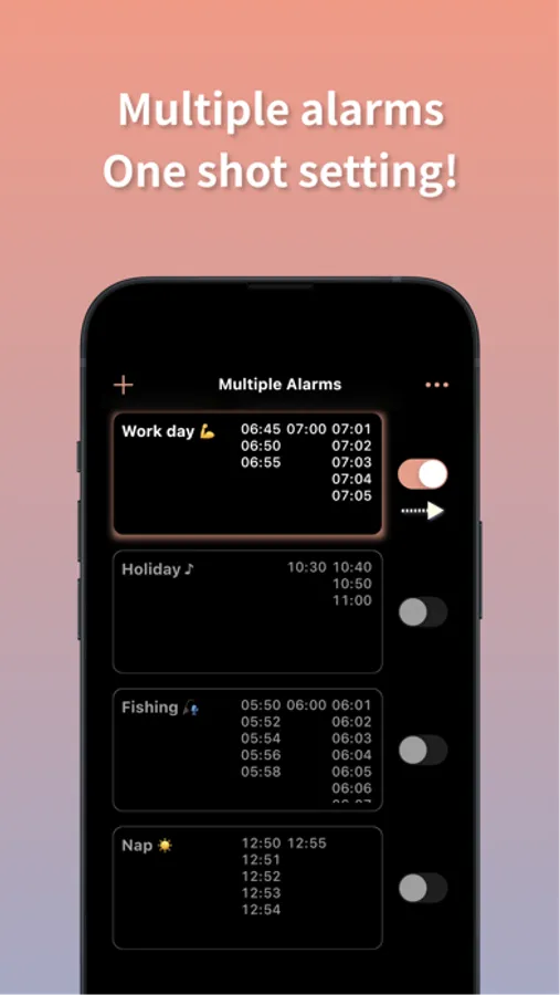 It is also possible to save alarm settings with multiple title names, such as "Workday," "Vacation," "Fishing," etc.