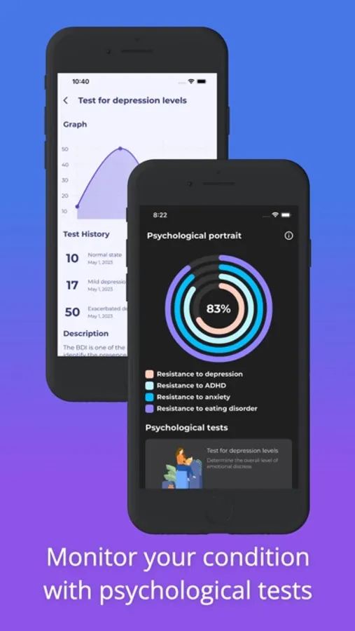 An additional feature of our app are psychological tests. They allow users to gain a deeper understanding of their emotions, thoughts and behavior. After taking the tests, users receive individualized feedback and advice on managing their emotions and thoughts.