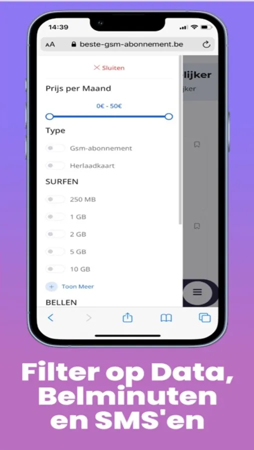 Ben je het beu om telkens alle gsm-abonnementen één per één te vergelijken? Wij doen het zware werk voor je, dankzij onze app kan je alle mobile abonnementen van Vlaanderen vergelijken in slechts enkele minuten. Filter alle Herlaadkaarten en Gsm-abonnementen van België op Data, Belminuten, SMS’en en Provider dankzij onze vergelijker.