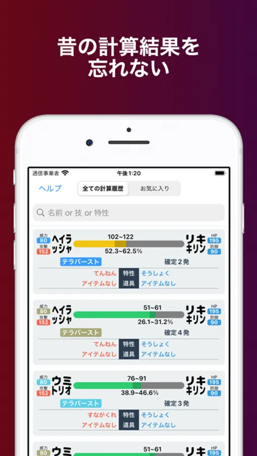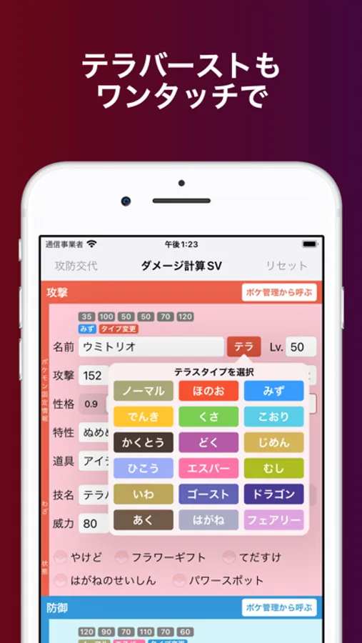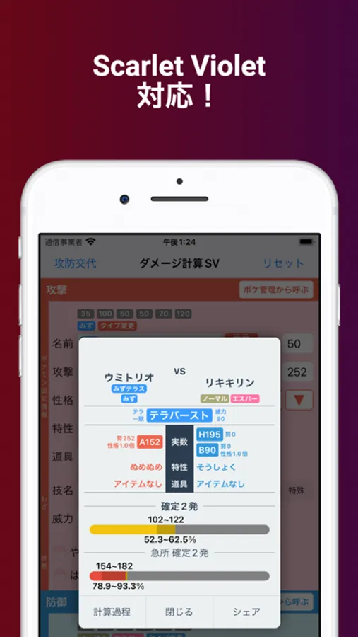 When you enter attacking/defending Pokémon, characteristics, effort values, moves, etc., the calculation results are displayed at the bottom of the screen in real time.