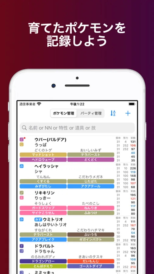 You can register Pokémon you have trained. In addition to status, techniques, and characteristics, you can also record Pokémon's Effort Value and comments.