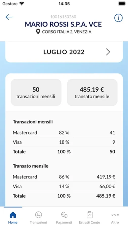 Tieni sotto controllo il bilancio mensile dell’azienda diviso in transazioni e transato, sia totale che differenziato per i singoli punti vendita, con dettagli su POS e circuiti utilizzati.