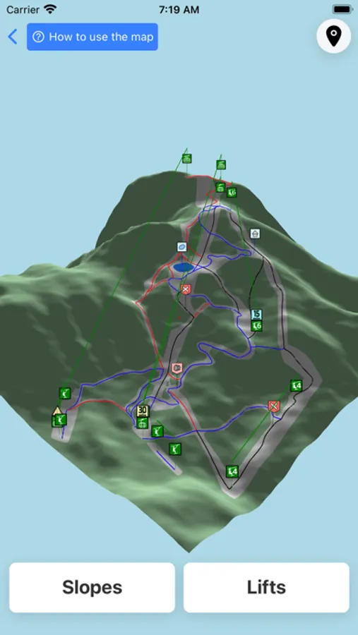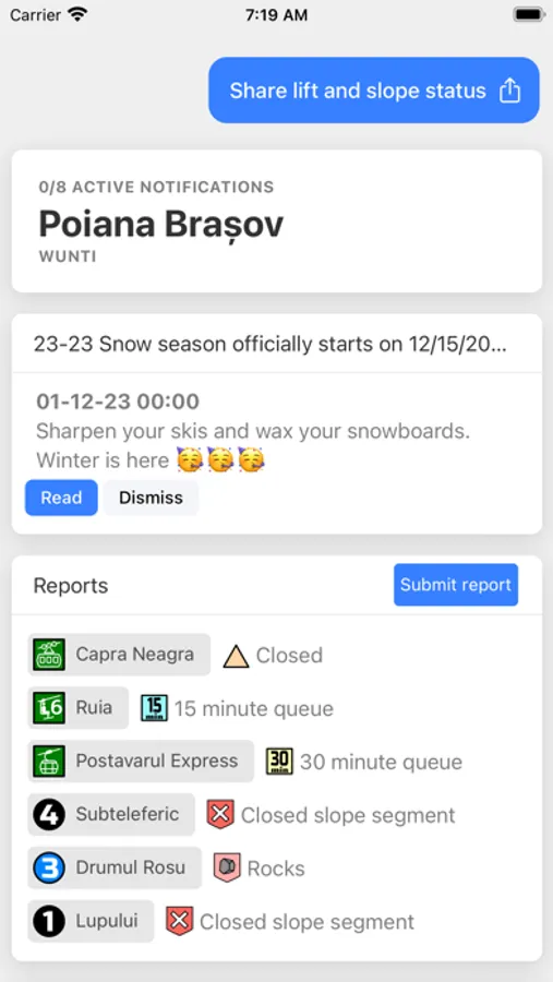 * A quick view of the lift lines and slope issues. The first thing you see when you open the app are the lifts that have lines and bad slope conditions. Hopefully everything is ok. But if it's not, you can share what you see with your friend.