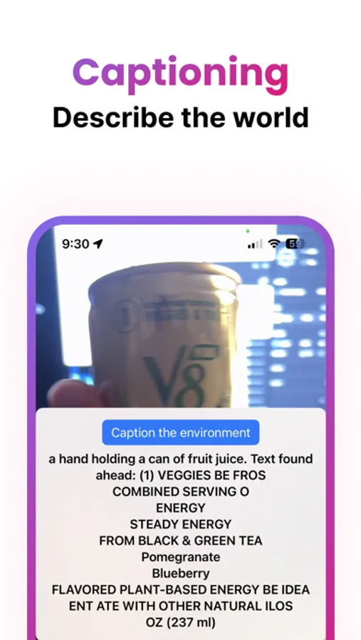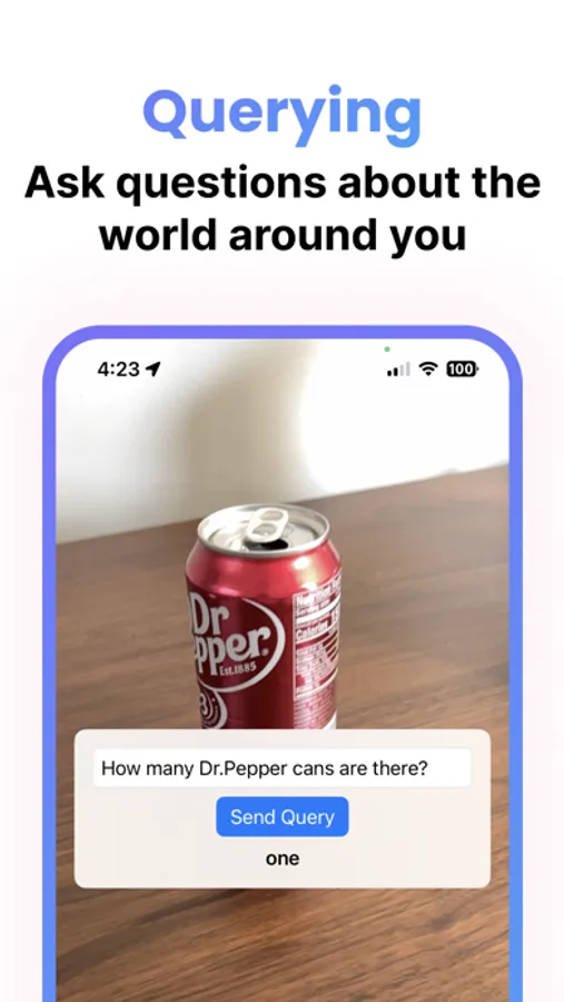 Captioning + Querying: Our captioning feature describes your surroundings, giving you a clearer picture of the world around you. Querying empowers you to ask questions about your environment.