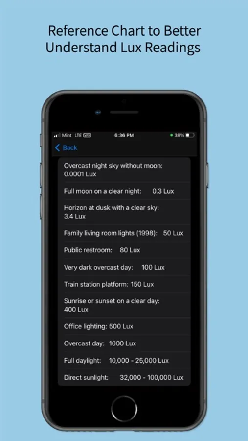 Measure light levels in any environment. Libre Light Sensor leverages your iPhone's camera to calculate luminosity as measured in Lux. This allows you to determine how much light exposure your eyes are receiving when you wake up, during the day, and before bed in order to optimize your sleep quality.