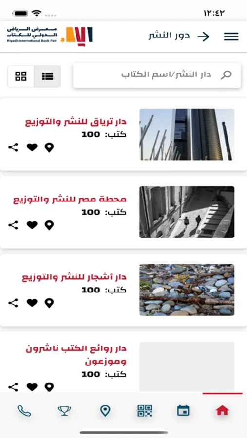 The Riyadh International Book Fair 2022 application presents several services to visitors and Publishing Houses, including the searching capability for books, Publishing Houses, authors, and the creation of Favorite List Service for Publishing Houses and books. It also provides a map of the exhibition with a reliable navigation feature. In addition, it offers the possibility to purchase tickets for concerts and cultural events accompanying the exhibition.