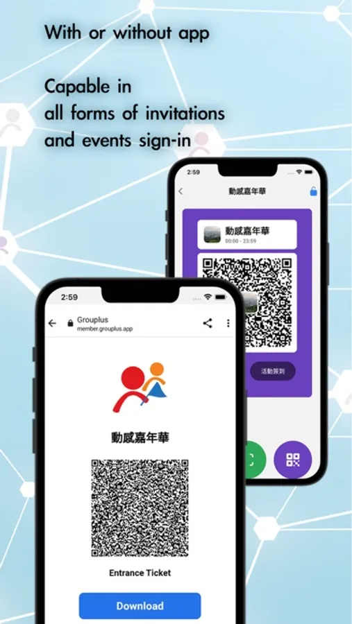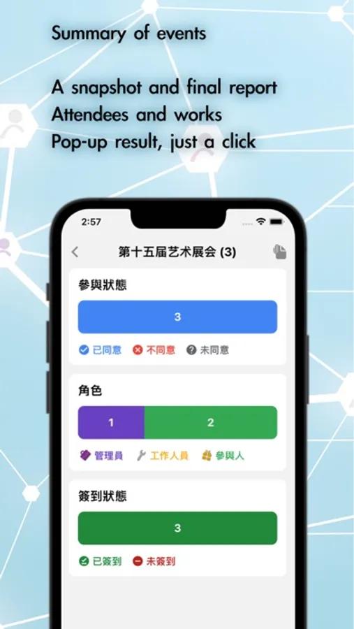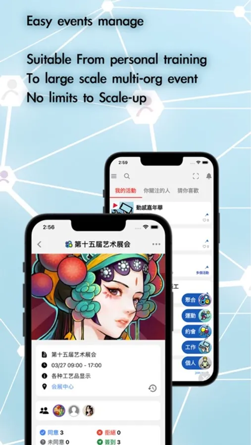 - Diversified participation options: accept or decline invitations, e-tickets, and various check-in methods, any format with or without the app installed;