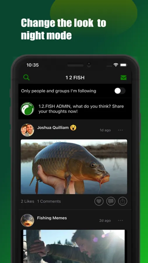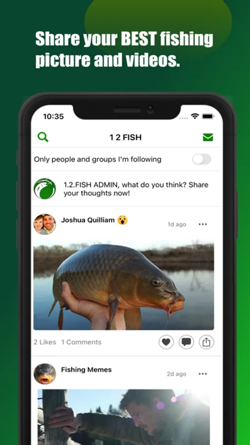 1 2 FISH is a social app for angling enthusiasts, share your pictures and videos, as well as chat with other anglers. Create a simple profile and join the 1 2 FISH groups. Use the 1 2 FISH Market place to buy and sell anglering gear.
