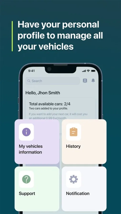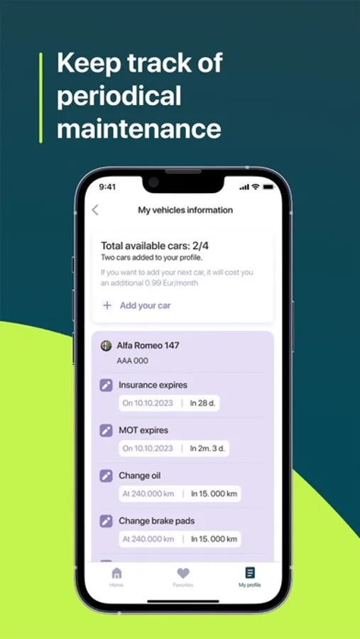 • Easily keep track of your vehicles' maintenance work schedule. When to change brake pads, air filters, or engine oil.