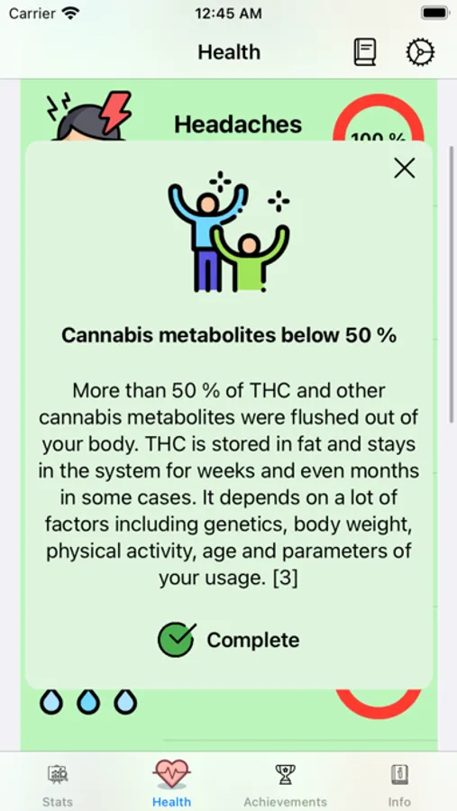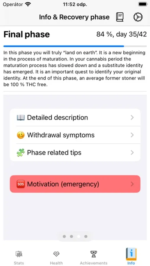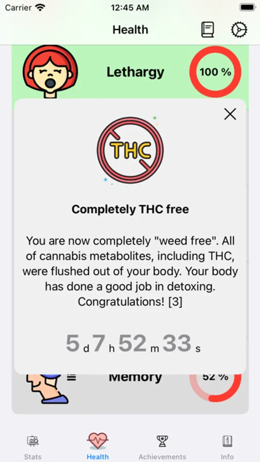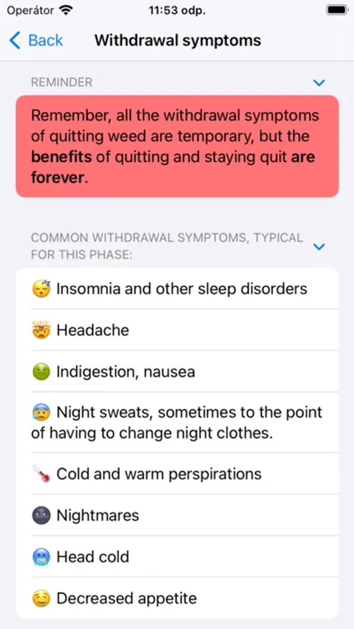 - see how your health improves, this section contains various health benefits you are gaining by not using weed, including a list of withdrawal symptoms and tracking time needed for the symptom to be gone