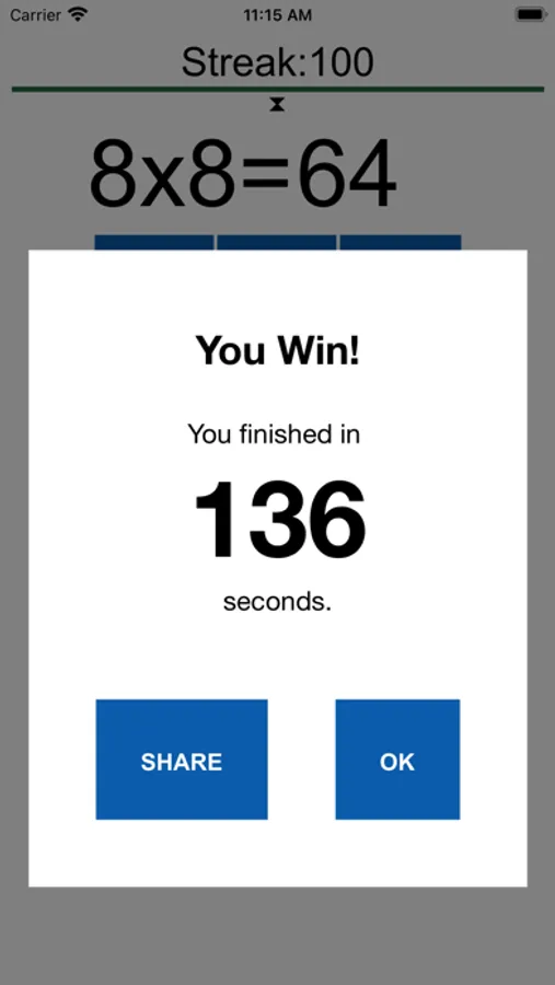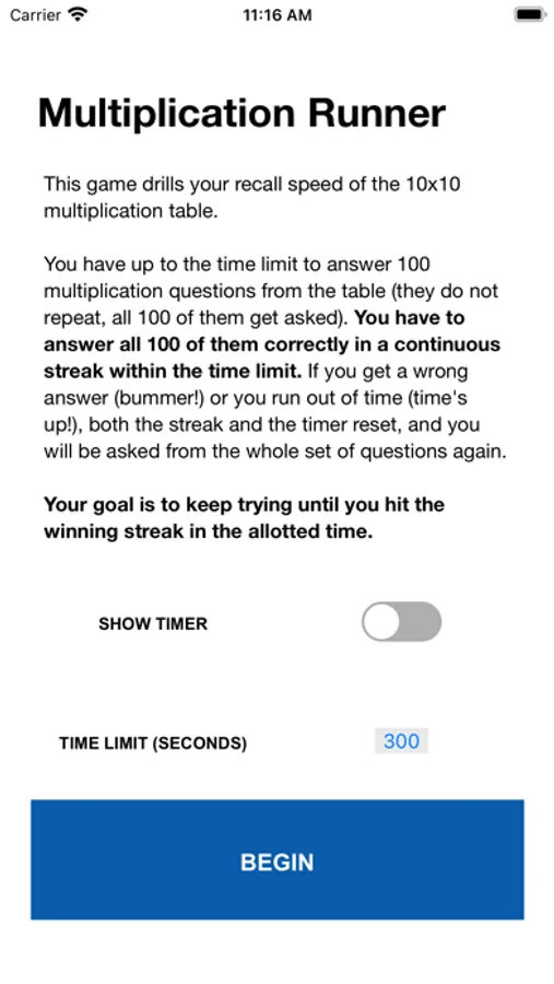 You have up to the time limit to answer 100 multiplication questions from the table (they do not repeat, all 100 of them get asked). You have to answer all 100 of them correctly in a continuous streak within the time limit. If you get a wrong answer (bummer!) or you run out of time (time's up!), both the streak and the timer reset, and you will be asked from the whole set of questions again.