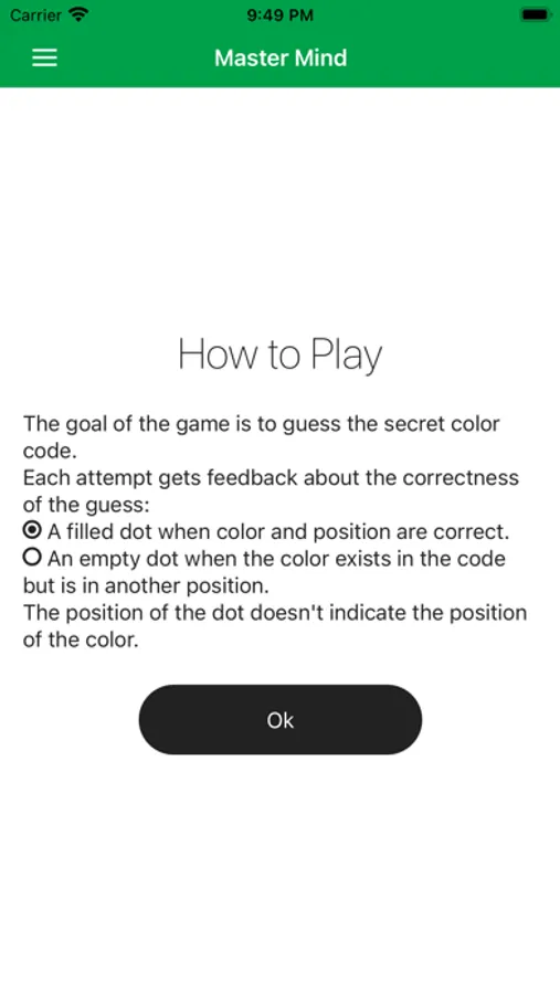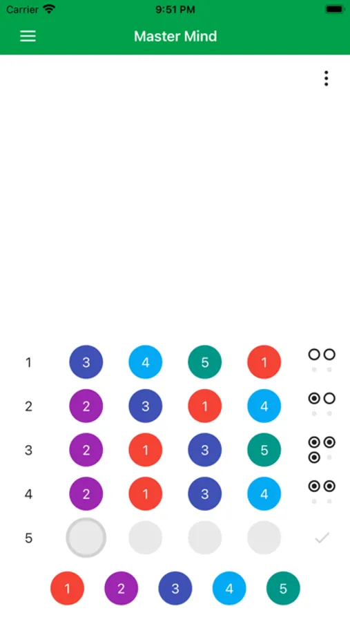 In the classic mastermind two people play but with this application you can compete against the machine. The machine will create a secret color code that you must decipher in as few attempts as possible.