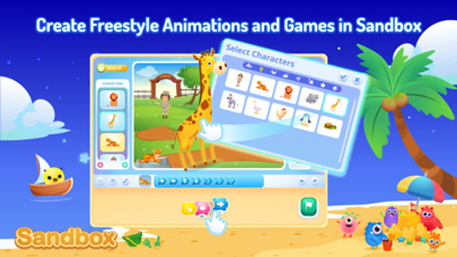 ■ Create freestyle animations and games with code blocks in the Sandbox area.