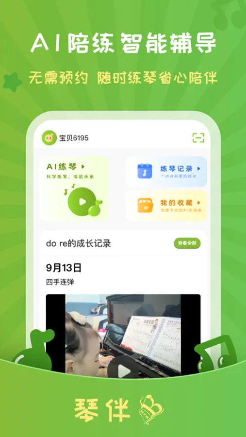 琴伴AI,是一款为所有琴童打造的一款陪伴学习的软件,成长记录功能可以记录琴童学琴过程中的精彩瞬间。AI陪练功能可以24小时随时陪伴琴童练琴,包含了海量曲谱,练琴时可以从音准、节奏、完整性上对琴童弹琴做多维度的测评,让孩子课后练琴更有效。