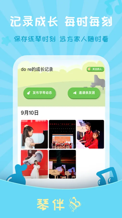 家长和老师都可以维护琴童的成长记录,一起把琴童学琴过程中的精彩瞬间记录下来,给琴童和家长留下美好的纪念。