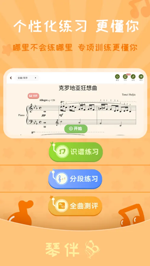 AI陪练功能可以根据不同练习阶段选择对应的练琴模式,针对性的帮助琴童渡过练琴的各个阶段,高效准确的陪伴琴童练好每一首曲子