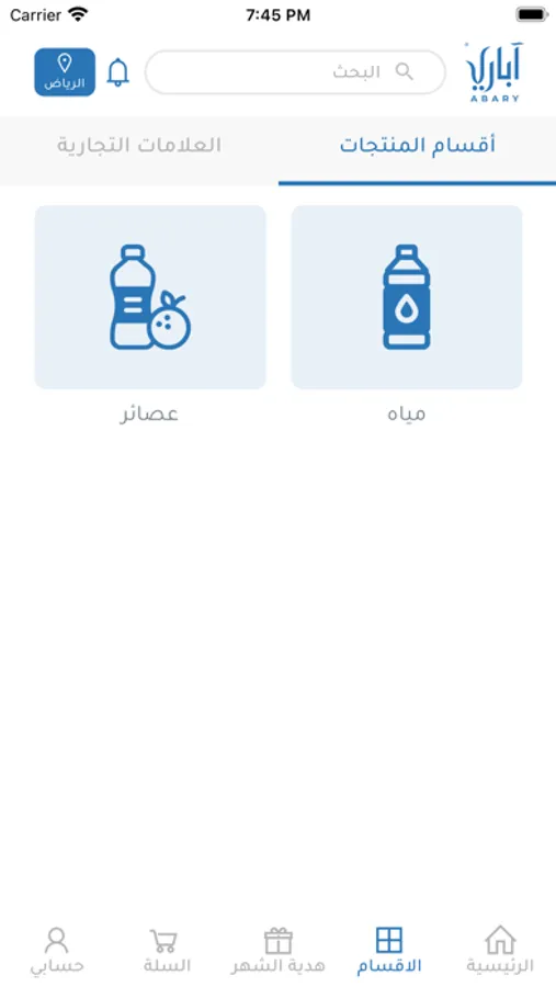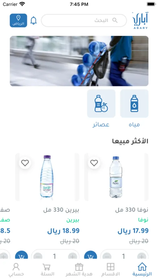 تطبيق آباري متجر الكتروني متكامل لتوصيل المياه بمختلف انواعها ، يقدم خدمة توصيل المياه للمنازل و المساجد و المدارس و المخيمات و الإستراحات و المستشفيات و قاعات الافراح والمنازل
