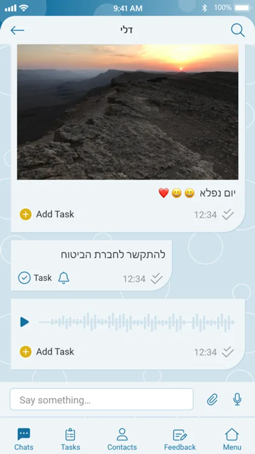 הכל במקום אחד - צ'אט מיידי וקל הכולל טקסט, הודעות קוליות והעלאת מדיה מכל הסוגים.