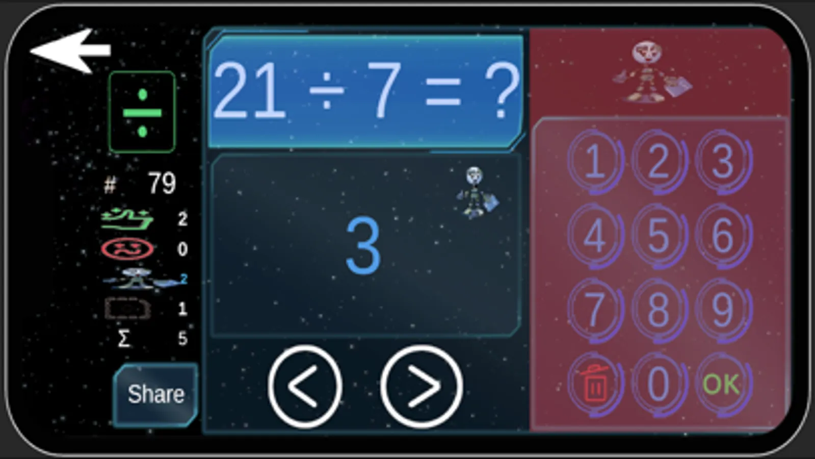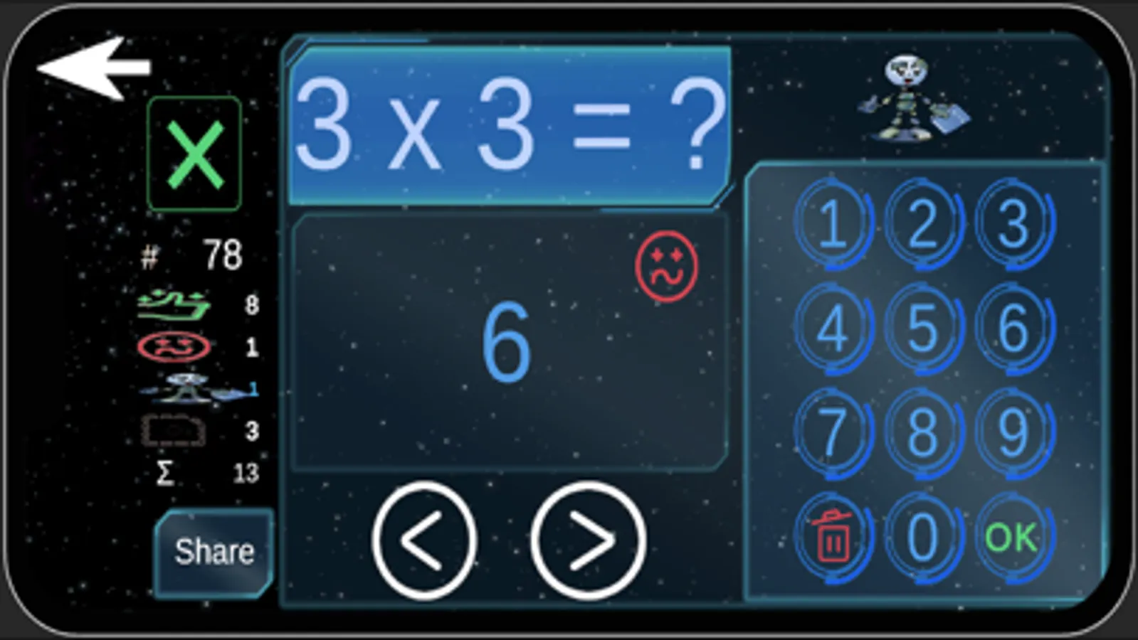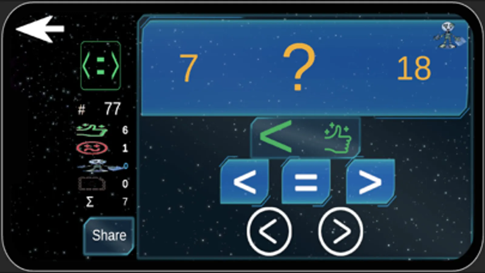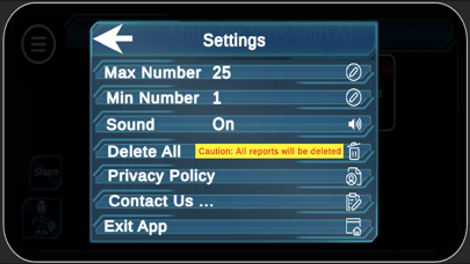 Kids Math Learning App ask questions within certain number range (default Min value 1- Max value 25), it can be changed (from 1 to max 100000) from menu according to the kids expertise or progress. min max number range. Progress can be checked later. From settings all progress can be deleted as well.