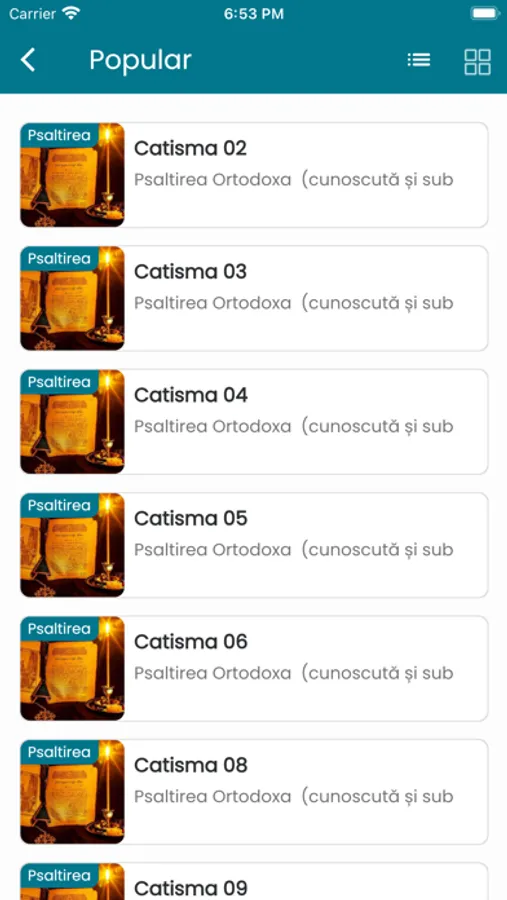 Psaltirea este împărțită în 20 de catisme. Fiecare catismă este la rândul ei împărțită în trei stări. Fiecare stare conținând de obicei 1–3 capitole. Excepție face Psalmul 118. Datorită lungimii sale acest capitol constituie întreaga Catismă a XVII-a.