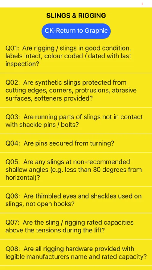 Slings - 17 questions (e.g. "Are any slings at non-recommended shallow angles (e.g. less than 30 degrees from horizontal)?")