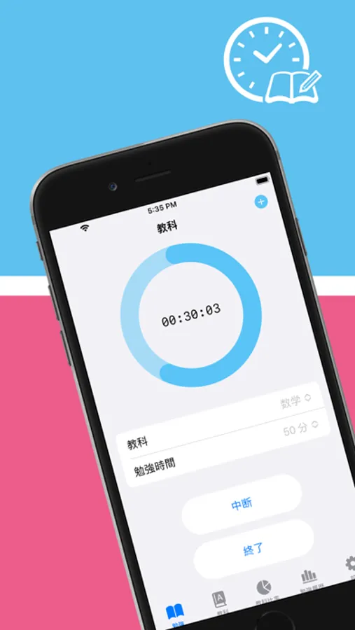 教科を選択し、勉強時間を設定してカウントを行うことにより勉強時間を記録します