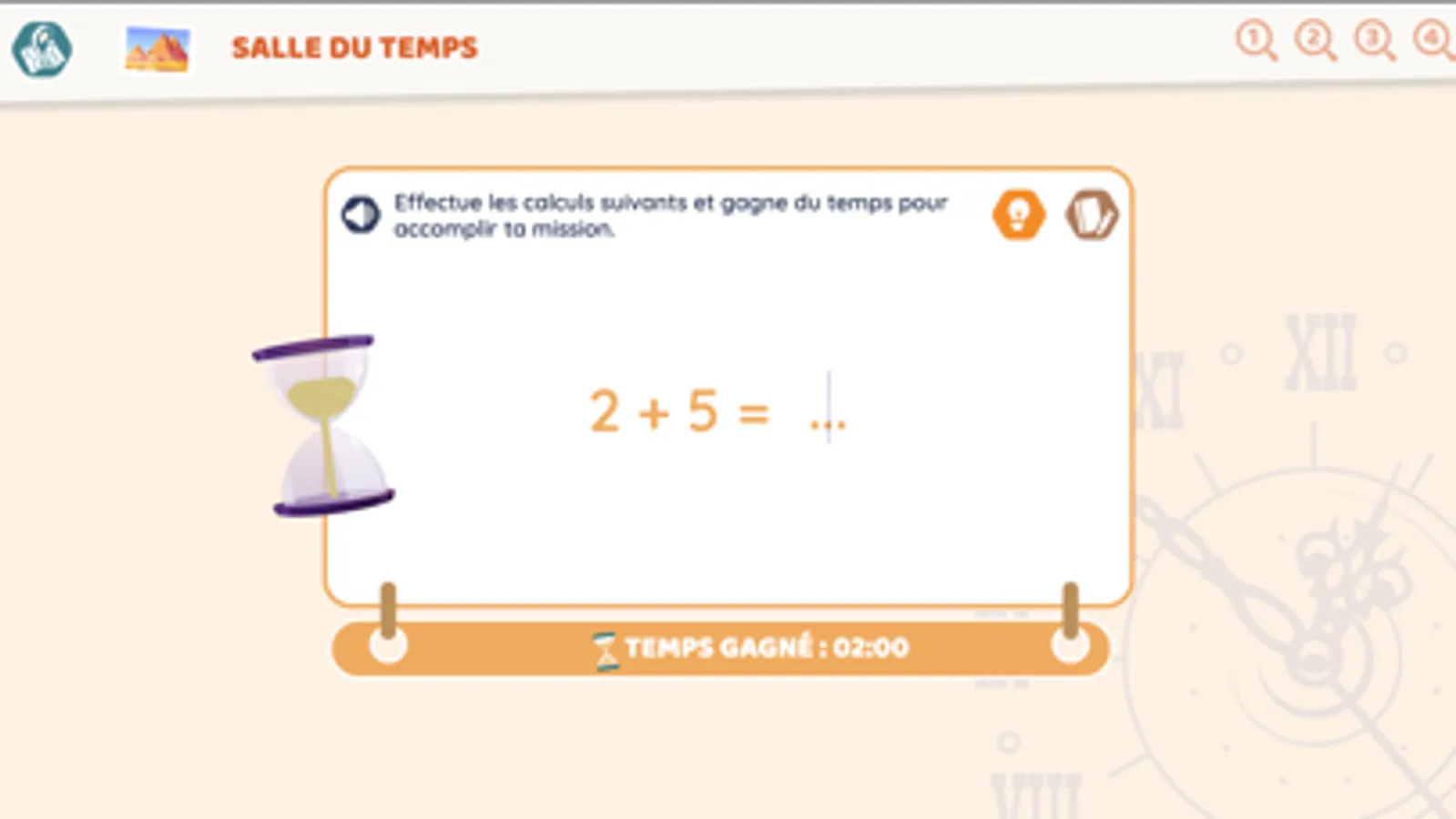 2. Salle du temps : l’élève doit gagner du temps pour sa mission en faisant du calcul mental.