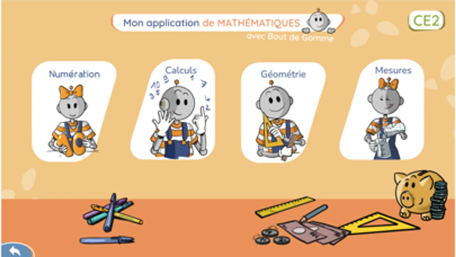 Cette application, accessible depuis la plateforme Jocastore, propose 300 exercices de base reprenant l’ensemble du programme mathématiques CE2 à travers quatre catégories :