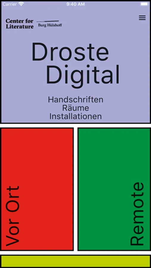 Die App zur Ausstellung ›DROSTE DIGITAL. Handschriften – Räume – Installationen‹ auf Burg Hülshoff in Havixbeck bei Münster. Zum ersten Mal macht eine Ausstellung die digitalisierten Handschriften der Dichterin Annette von Droste-Hülshoff zugänglich. Erlebt auf Burg Hülshoff, dem Geburtsort der Poetin, den Kosmos ihrer mikroskopisch kleinen Handschriften. Auf der Burg könnt ihr sechs neue Räume entdecken. Um die Handschriften in die Gegenwart zu holen, haben wir Schriftstellerinnen und Künstler*innen-Kollektive eingeladen, sich mit den Textbildern zu beschäftigen und einzelne Räume zu gestalten. Die App erweitert die Ausstellung in den digitalen Raum hinein. Vor Ort lassen sich die Ausstellungsräume mit Hilfe von augmented reality erleben. Aber auch von zu Hause aus oder von unterwegs macht die App einen digitalen Besuch der Ausstellung möglich.