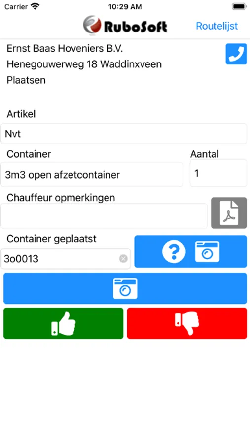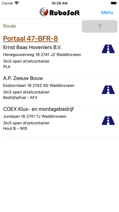 App voor chauffeurs die gebruik maken van Rubosoft WMS.Hierin kunnen zij o.a. de route inzien, navigeren naar bestemming, de klant bellen, foto's maken en de order van commentaar voorzien. Verder kunnen zij de begeleidingsbrief tonen en laten ondertekenen, QR codes scannen en urgente berichten vanuit de planning lezen. Ook kunnen zij weeggegevens doorgeven aan externe verwerkers en zelf wegingen uitvoeren.
