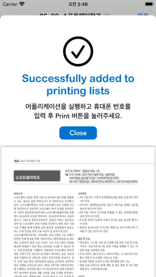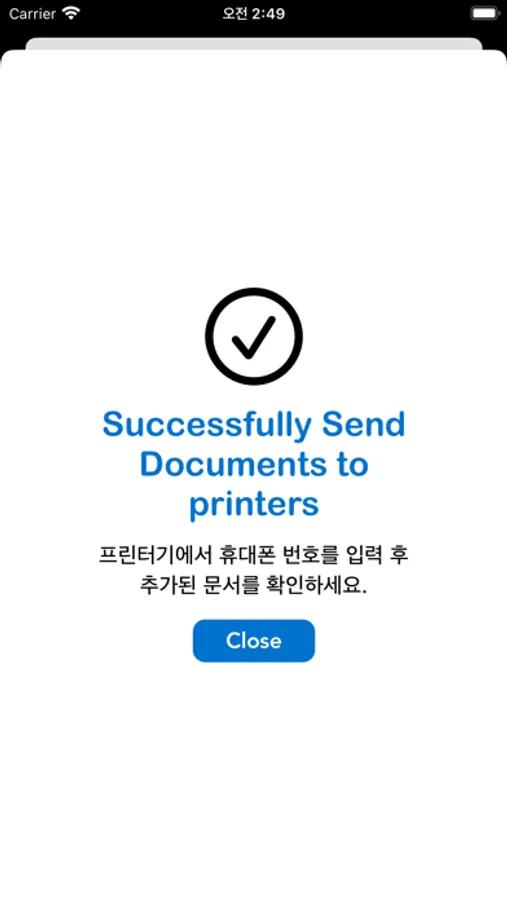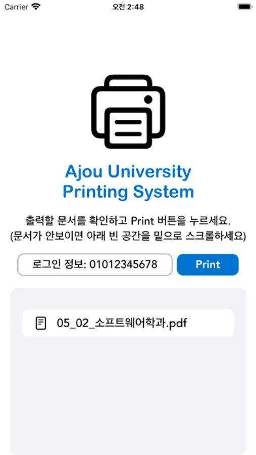 모바일에서 pdf 파일을 열고 공유 버튼을 눌러 이 프린터 앱으로 파일을 공유하세요. 앱으로 돌아와서 휴대폰 번호를 입력하고 문서를 확인한 뒤 print 버튼을 누르면 끝. 쉽죠?