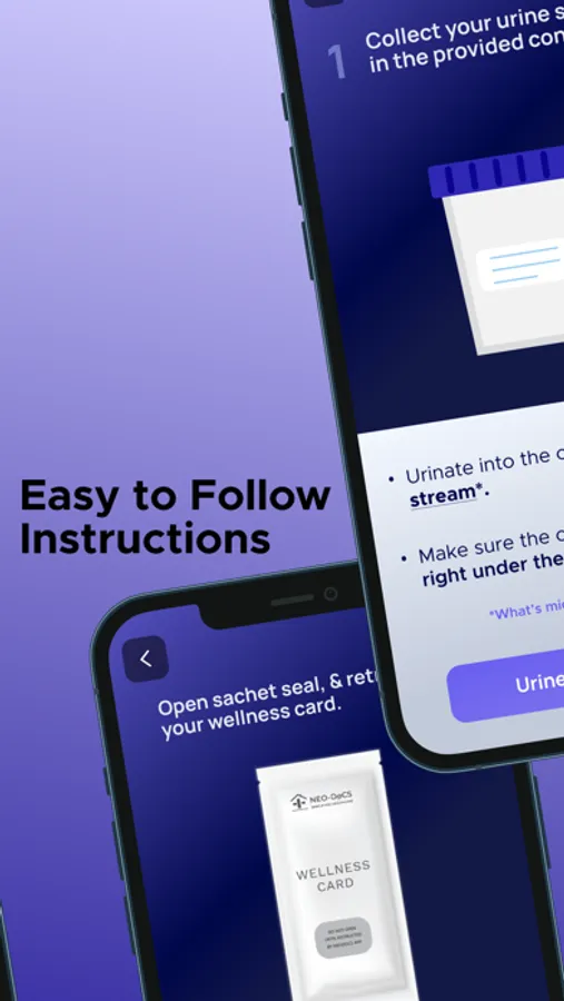 1. Simply dip the wellness card into the urine cup provided for 1 second; wait for two minutes, and then scan it using the Neodocs app