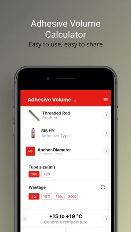 It also includes a simple, easy, and rapid adhesive volume calculator, which will help you determine the injection mortar requirement for chemical anchors on your job in just a few seconds - and share your discoveries with your team!