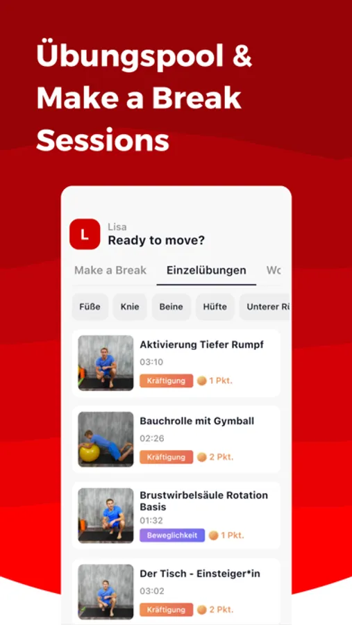 Darin findest du eine Übungssammlung mit den wichtigsten Übungen und Workouts, um beweglich und kräftig zu bleiben. Von Kopf bis Fuß ist für viele Probleme und Wehwehchen die richtige Übung dabei - Nackenverspannungen, Rückenschmerzen und Knieprobleme gehören damit der Vergangenheit an. Deine Lieblingsübungen kannst du auch als Favoriten abspeichern.