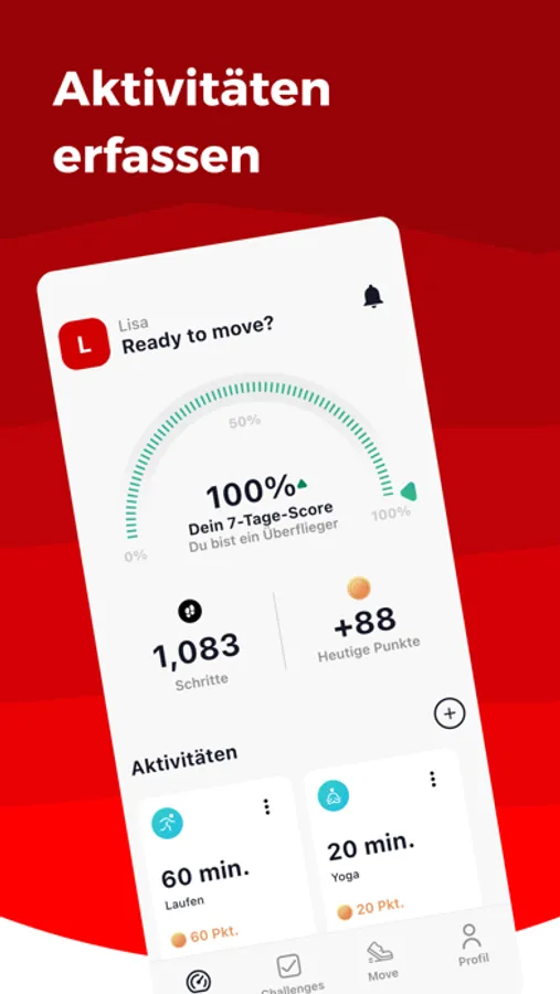• Aktivitäten erfassen: Auch mit deinen sportlichen Aktivitäten sammelst du Punkte. Wähle aus einer Vielzahl von Sportarten und hole dir zusätzliche Punkte für deinen Score.