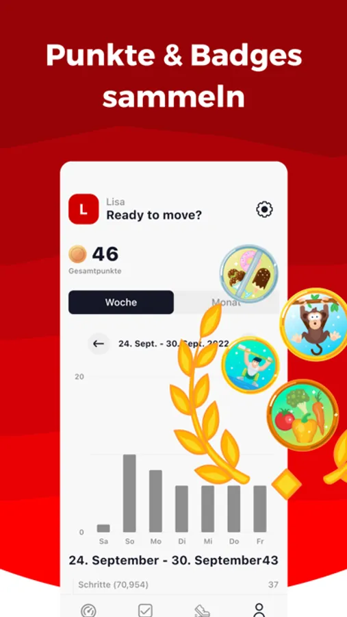 Hier siehst du deine persönlichen Aktivitätsstatistiken der letzten Wochen und Monate. Sammle Punkte und Abzeichen für deine Aktivitäten.