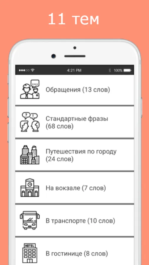 Для изучения, в разговорнике представлены следующие темы: