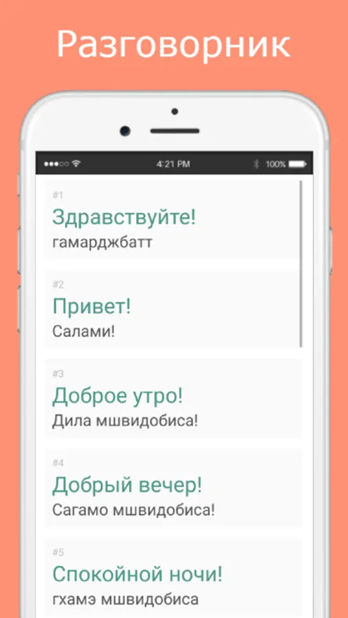 Русско-грузинский разговорник можно использовать соответственно, как разговорник, так и инструмент для изучения грузинского языка. Все грузинские слова написаны русскими буквами и разбиты на 11 логических тем, то есть разговорник рассчитан на русскоговорящего пользователя (туриста).