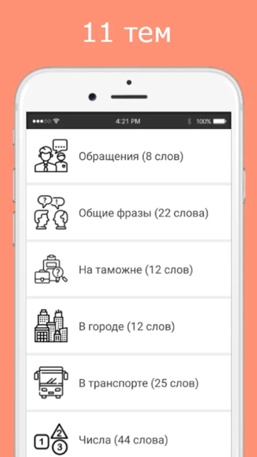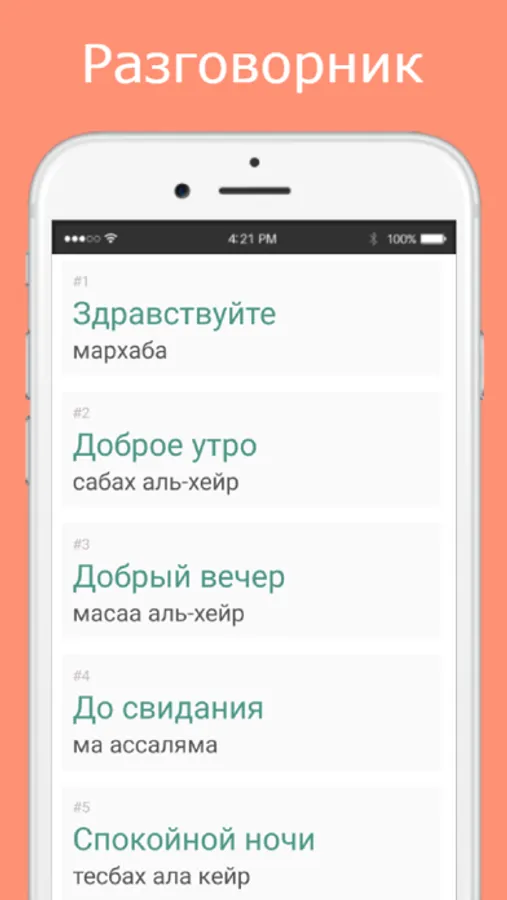 Русско-арабский разговорник можно использовать соответственно, как разговорник, так и инструмент для изучения арабского языка. Все арабские слова написаны русскими буквами и разбиты на 11 логических тем, то есть разговорник рассчитан на русскоговорящего пользователя (туриста).