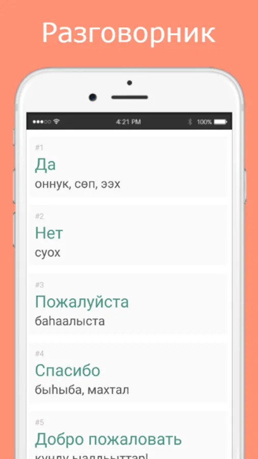 Русско-якутский разговорник можно использовать соответственно, как разговорник, так и инструмент для изучения якутского языка. Все якутские слова написаны русскими буквами и разбиты на 17 логических тем, то есть разговорник рассчитан на русскоговорящего пользователя (туриста).