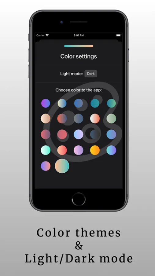 - choose light or dark mode and there are a several different colour palettes for your app color.