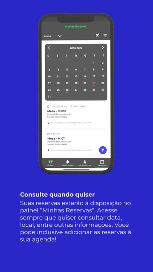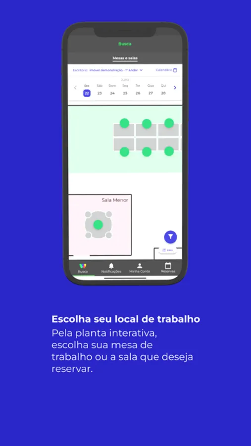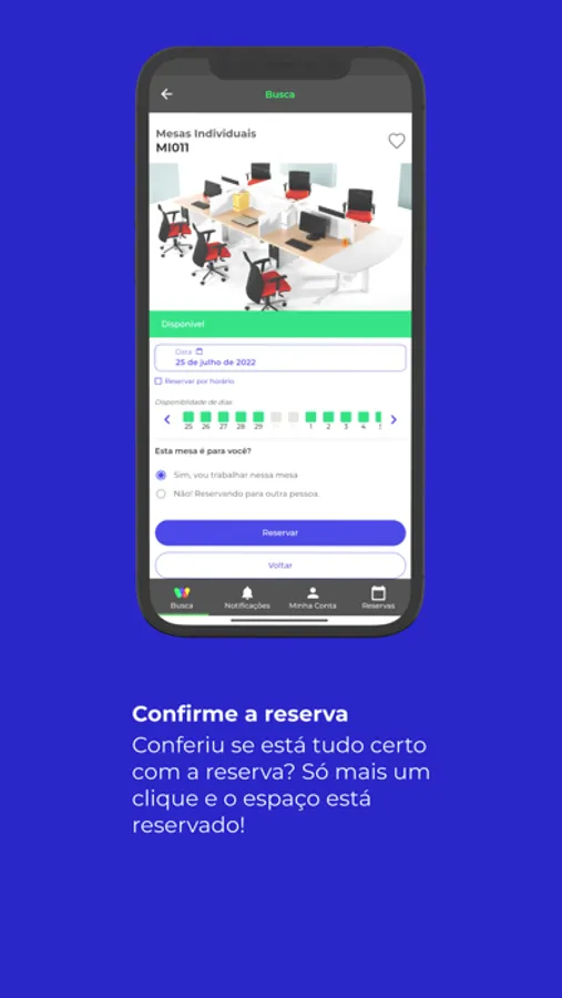 O colaborador realiza o agendamento, de forma simples e rápida, de estações de trabalho, espaços para reunião, salas privativas, vagas de