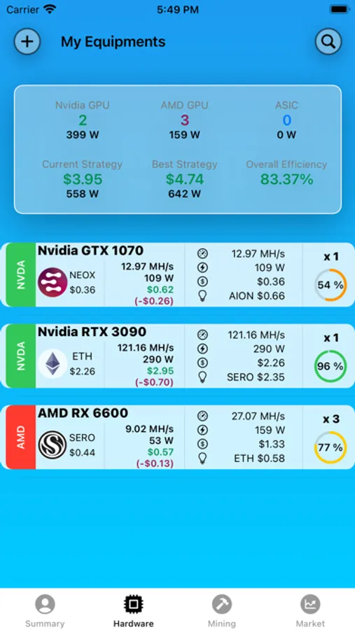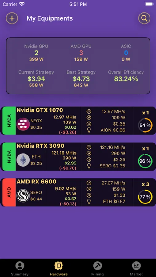 Now Mining Mate comes to help. It helps all GPU and ASIC miners find the new balance between electricity cost and mining reward. With Mining Mate, miners are able to track realtime market, network and reward status of mineable coins. Meanwhile, after adding GPU and ASIC rigs to your hardware list, Mining Mate automatically provides optimal and the most profitable coin combinations. With Mining Mate, you don’t need to struggle with the selection of coins and algorithms any more!