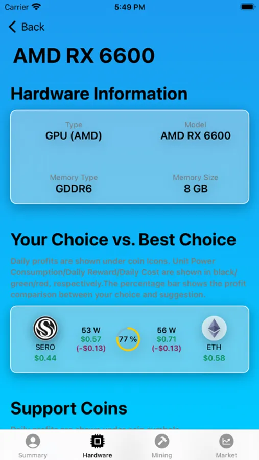 4. Realtime mining profit, reward, and cost analysis based on user's hardware list.