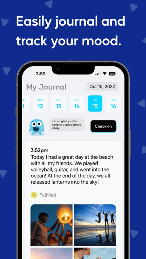 • Check in with Tappy to log how your feel and why you're feeling that way, and write a bit about it. You also have the option to upload any relevant photos!